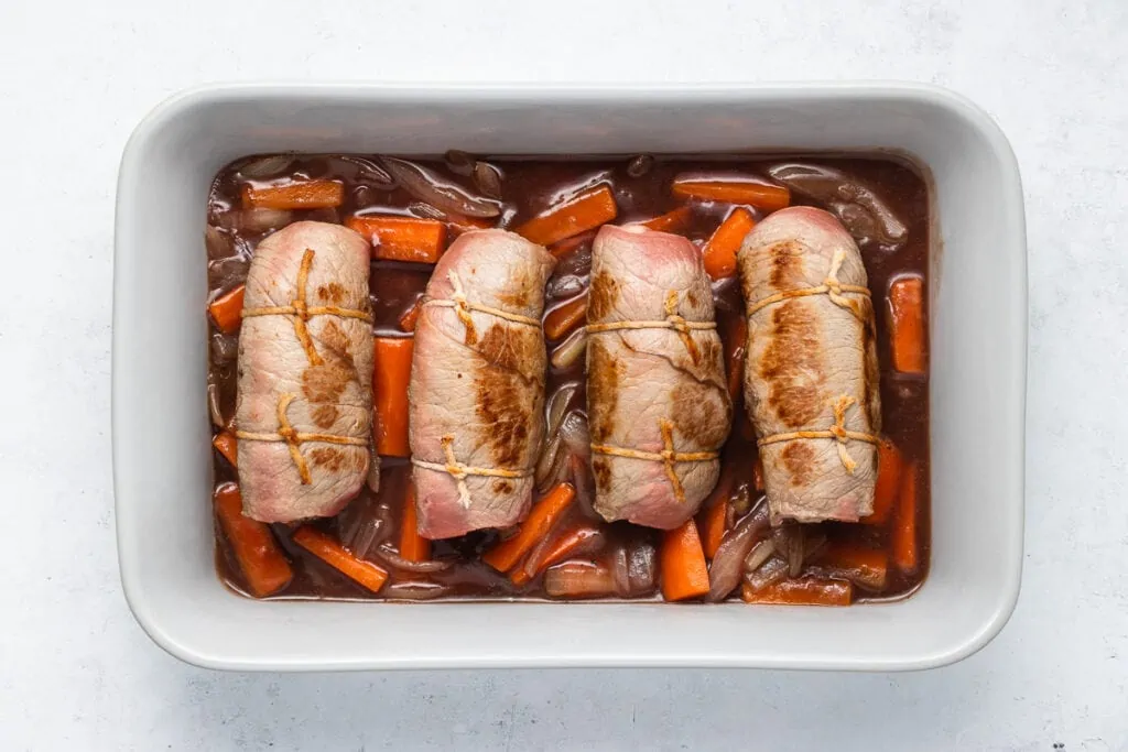 - Transfer the sauce to a baking dish, then place the beef olives on top.