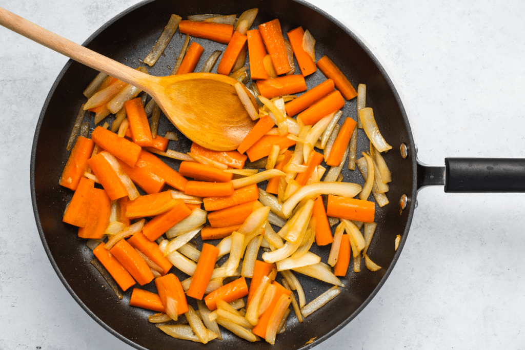 - Add another splash of oil to the pan. Add the onion and carrots and fry until softened – about 5 minutes.